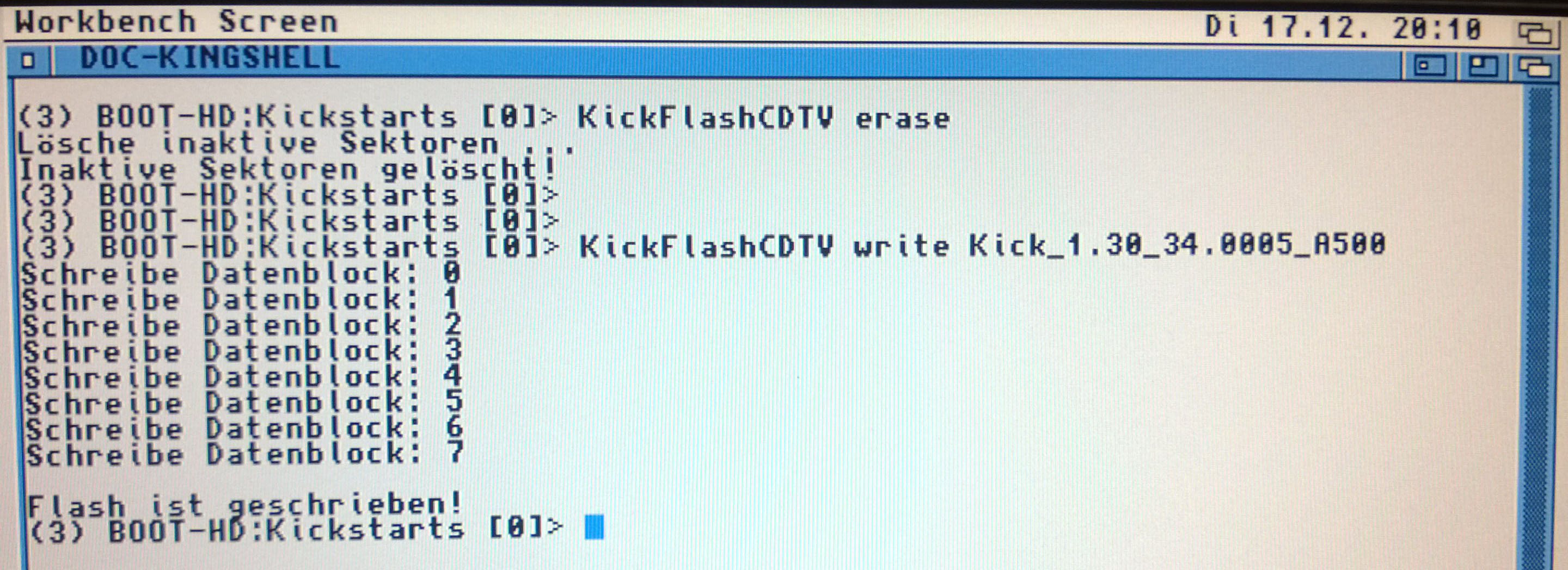 Das CDTV Boot-ROM unbedingt erst flashen, wenn das Kickstart erfolgreich geflashed wurde! Damit wisst ihr nämlich, daß das Modul funktioniert und das Boot-ROM auch ordnungsgemäß geflashed werden kann. Aus technischen Gründen ist eine Überprüfung dort nicht möglich.