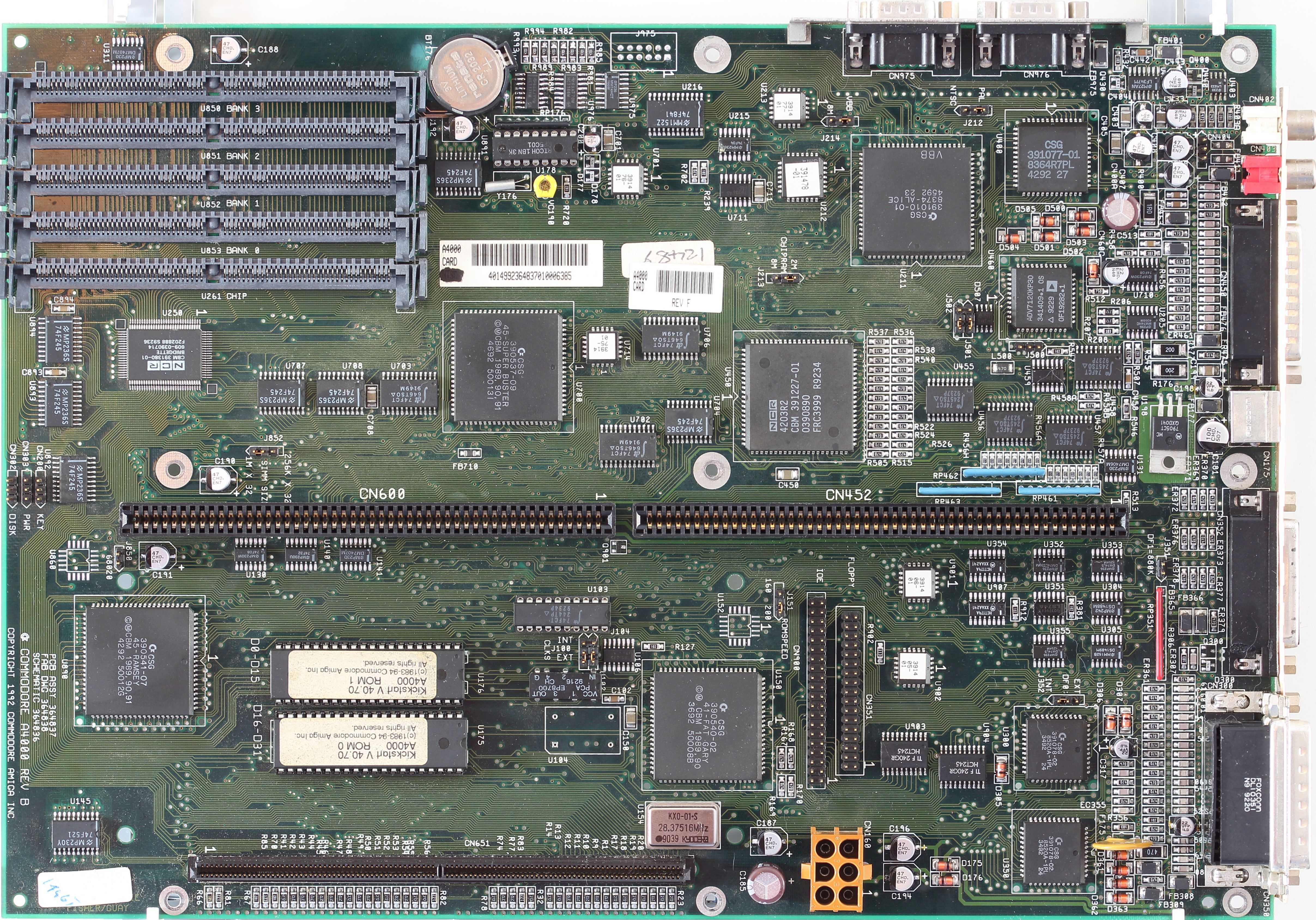 Amiga 4000 Hauptplatine, Rev B, reworked (Knopfzelle anstatt NiCD-Akku, R179 gegen Diode getauscht, dazu einige VIAs gefixt)